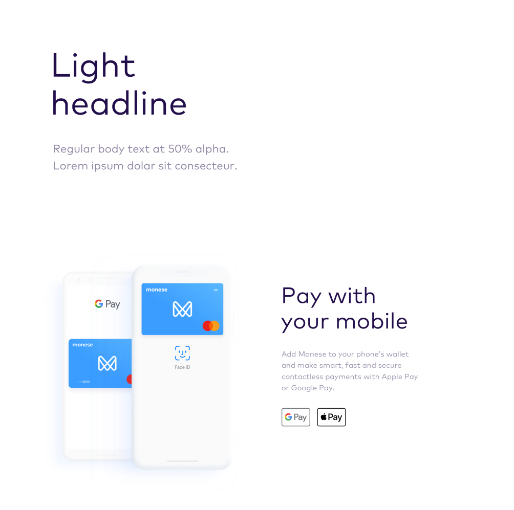 Our typeface – FF Mark – was chosen for it's carefully crafted glyphs that give it a strong, simple and bold edge with a reassuring and friendly feel, which help to marry it well with the rounded forms of the Monese logo mark.